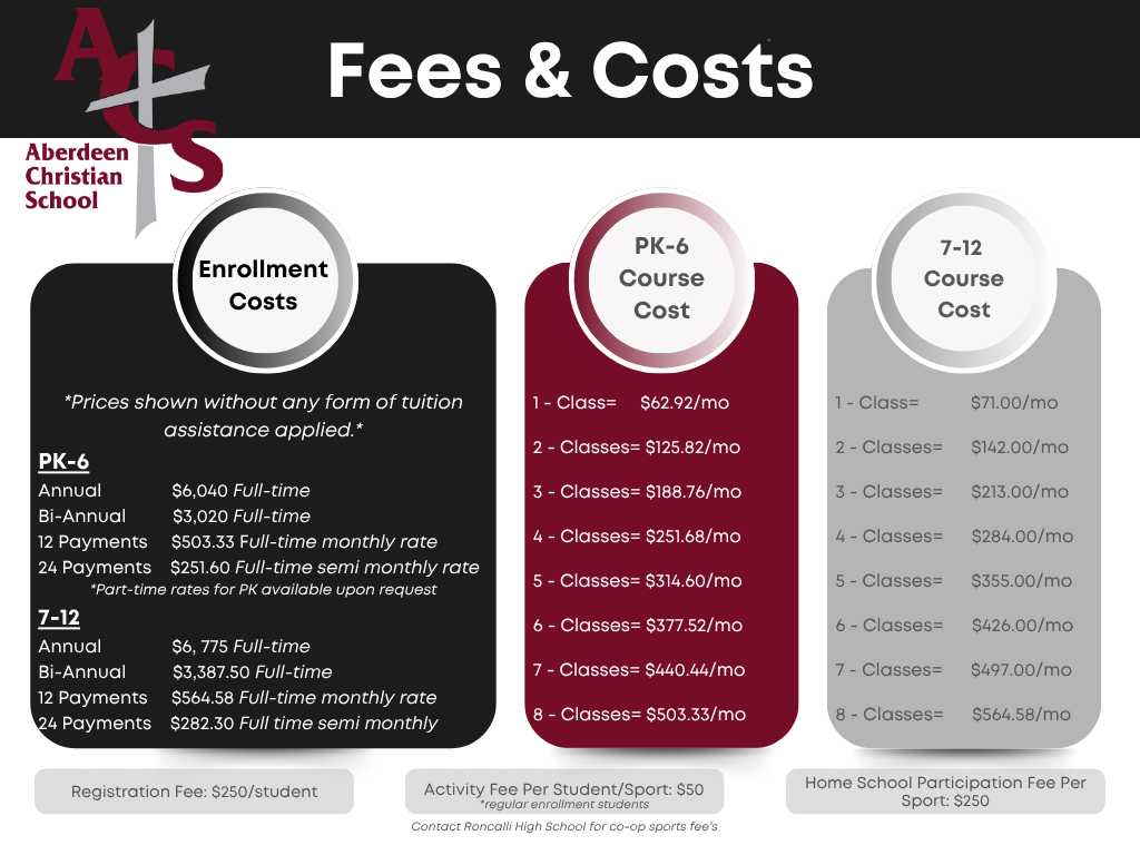 The cost for taking courses “à la carte” for students in grades PK-12 is prorated based on course registration. Please see our Fees and Cost sheet below for a breakdown of our fees. Our administration team can work with you to find a plan that best suits your needs.