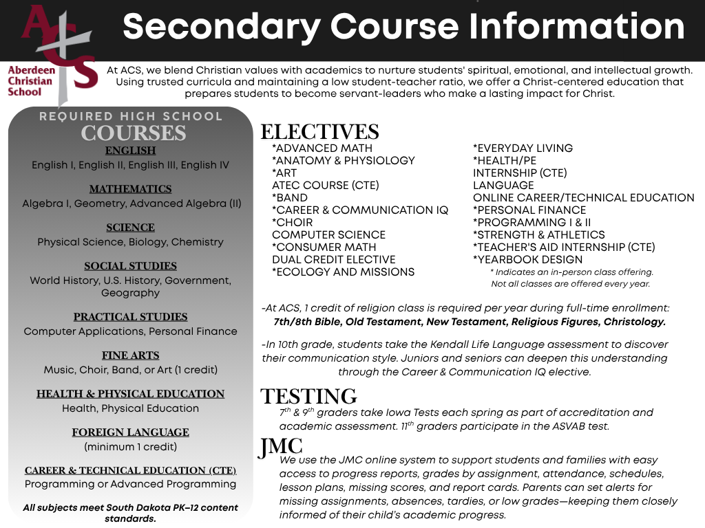 Homeschool students in grades 6-12 can also participate in fine arts, athletics, and other extracurricular programs at ACS. Please view our course information pages for a more detailed breakdown of course offerings at ACS.